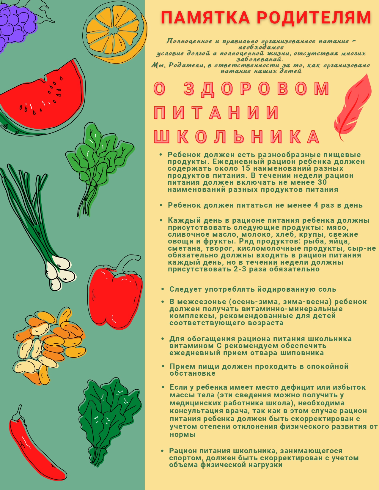 Памятка родителям о здоровом питании школьника
